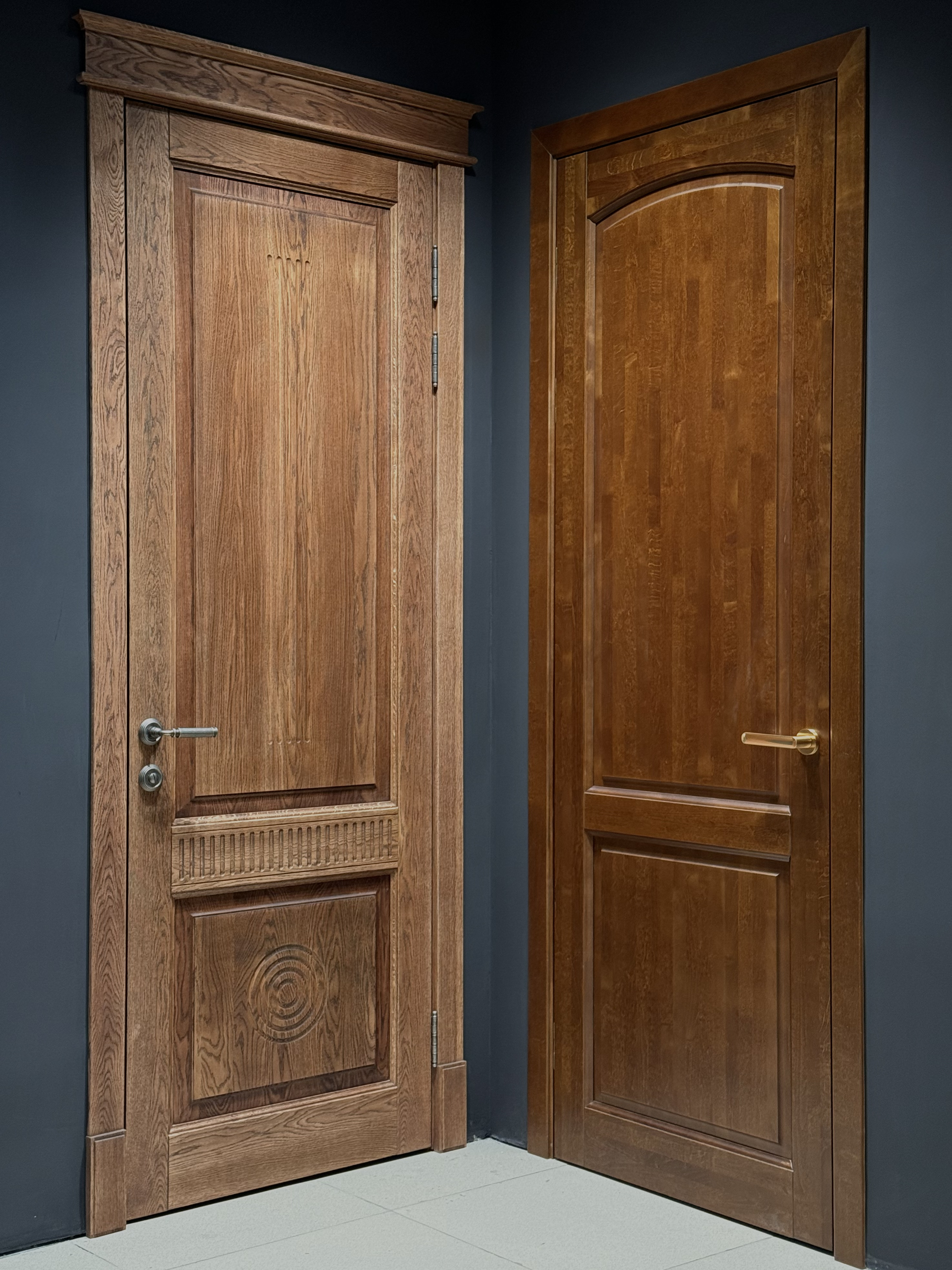 Мы работаем с российским и беларусским производством. Это несколько проверенных годами фабрик-партнёров, и производство под собственным брендом. В ассортименте представлены двери из массива высокого качества, в основном из дуба и сосны. Двери из массива изначально находятся выше средней ценовой категории. Например, базовый комплект двери из массива дуба без отделки стоит примерно 50 тысяч рублей.