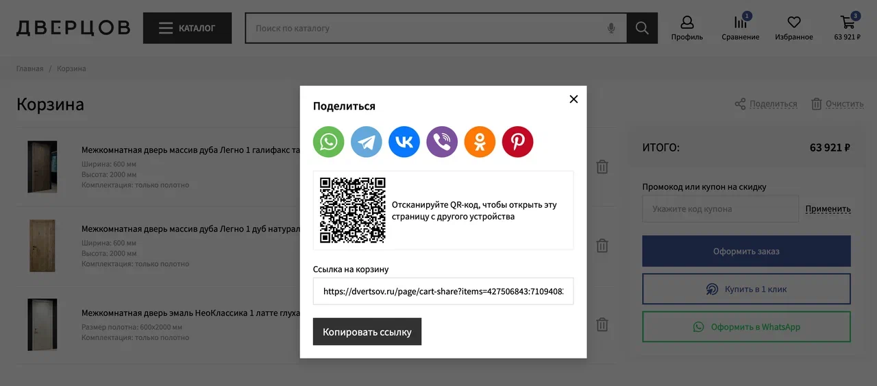Очень удобный инструмент для пользователя — «Поделиться корзиной». Покупатель может собрать корзину с нужными товарами и буквально в один клик отправить её другому человеку, кто участвует в принятии решения о покупке. Для клиента это сильно упрощает процесс согласования: не нужно заново искать товары, объяснять по телефону или пересылать десятки ссылок. Человек получает готовую корзину с уже подобранными позициями, ценами и конфигурациями. В итоге путь к покупке становится короче и комфортнее, а вероятность того, что заказ дойдёт до оформления, заметно выше.